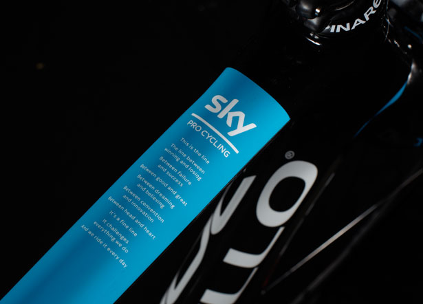 Probably the most well-known of these in the past few years is Team Sky’s ‘This is the line’ mantra printed on the top tubes of their Pinarellos. A lot of corny motivational stuff that the riders can glance down at now and then. I wonder if they look forward to Paris-Roubaix so they can tape their sector information lists over it.