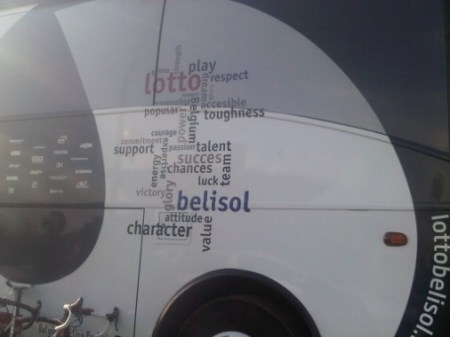 So yesterday I noticed a short story on Het Nieuwsblad, remarking upon how it was somewhat odd that the Belgian team would have their motivational buzzword chart-thing in English – “A strange finding on the bus of Lotto-Belisol.” This made me think about other such motivational words/phrases teams have used over the past two or three seasons, and I thought I would collect a few of them together.