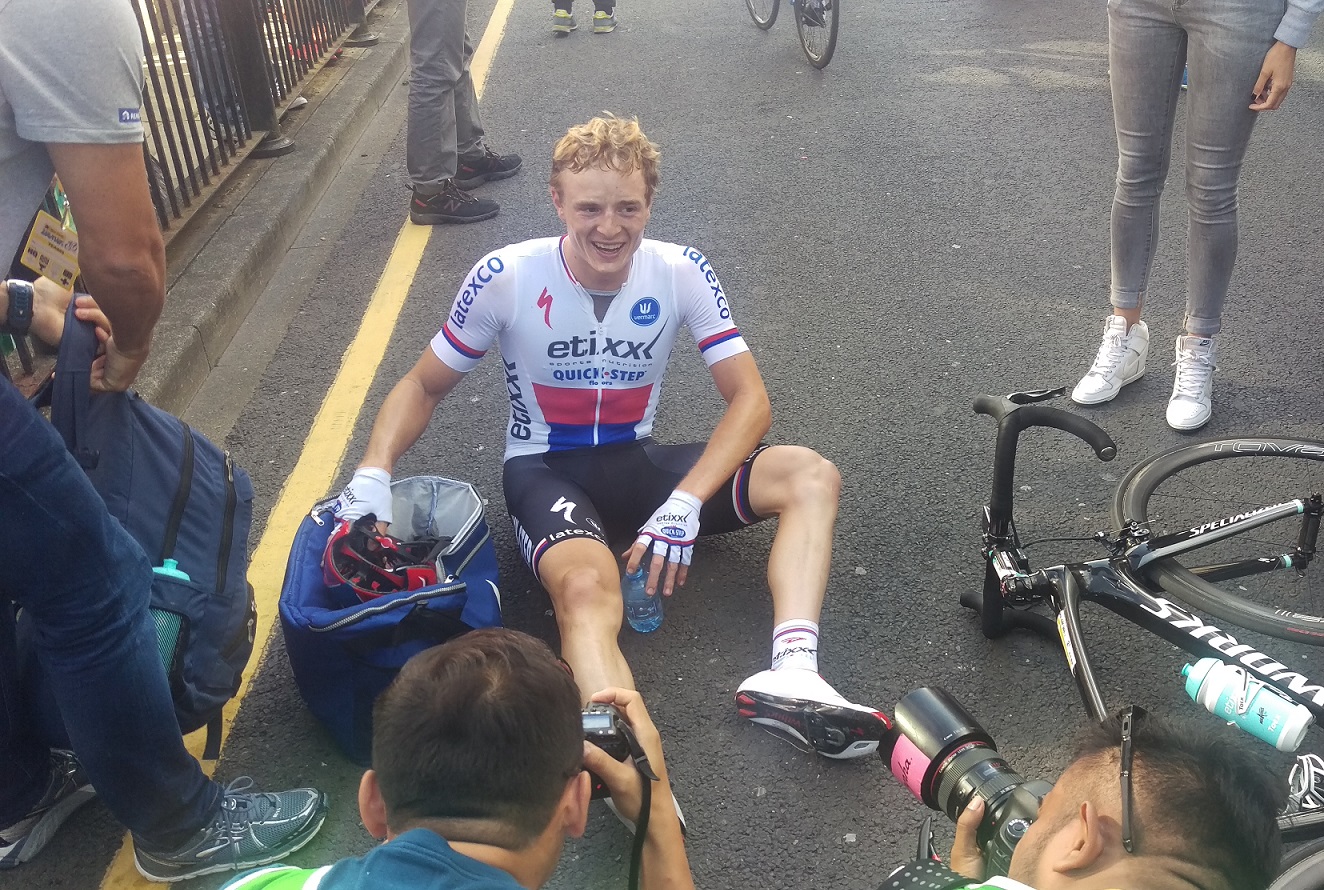 With Tinkoff-Saxo and Lotto-Soudal leading the chase, the 23-year-old seized his moment, holding on to win by seven seconds before collapsing, exhausted, metres after the line.