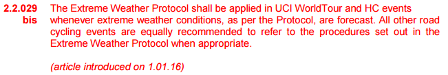 In essence, the regulation stipulates that a meeting between the major stakeholders (members of the organisation such as doctors and commissaires, as well as rider and team representatives) must be convened if extreme weather conditions are anticipated during the day’s stage. The conditions in question include: